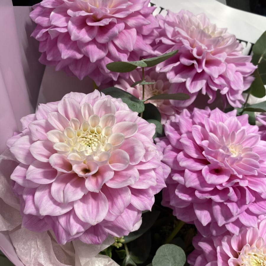 На фото букет из 7 розовых георгин. В составе: георгина 7 шт, эвкалипт 3 шт, дизайнерская упаковка 1 шт, атласная лента 1 шт, . Все цветы свежие и ароматные, букет красиво оформлен и отлично подходит для подарка. Доступна доставка цветов или самовывоз.