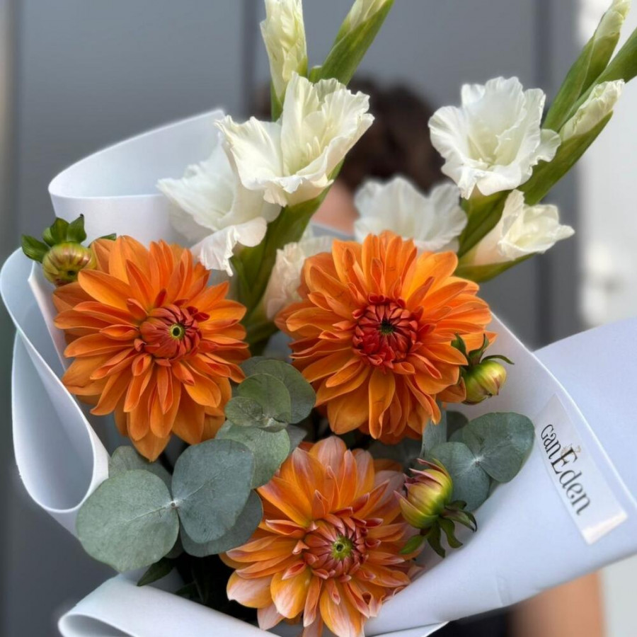 На фото букет с георгинами и гладиолусами. В составе: георгина 3 шт, гладиолус 2 шт, эвкалипт 2 шт, дизайнерская упаковка 1 шт, атласная лента 1 шт, . Все цветы свежие и ароматные, букет красиво оформлен и отлично подходит для подарка. Доступна доставка цветов или самовывоз.
